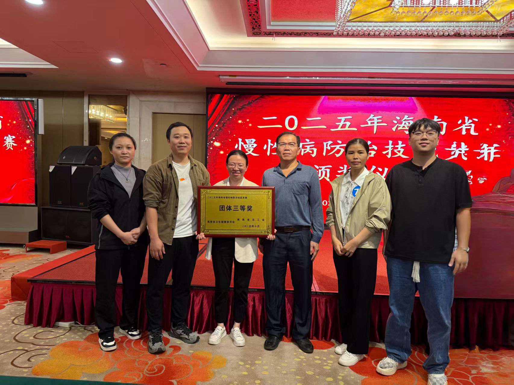 2025年10月29日,我院与市疾控中心、市人民医院慢病中心联合组成的琼海代表队在2025年海南省慢性病防治技能竞赛荣获团体三等奖。我院公卫科袁水娇作为代表队成员之一参赛。